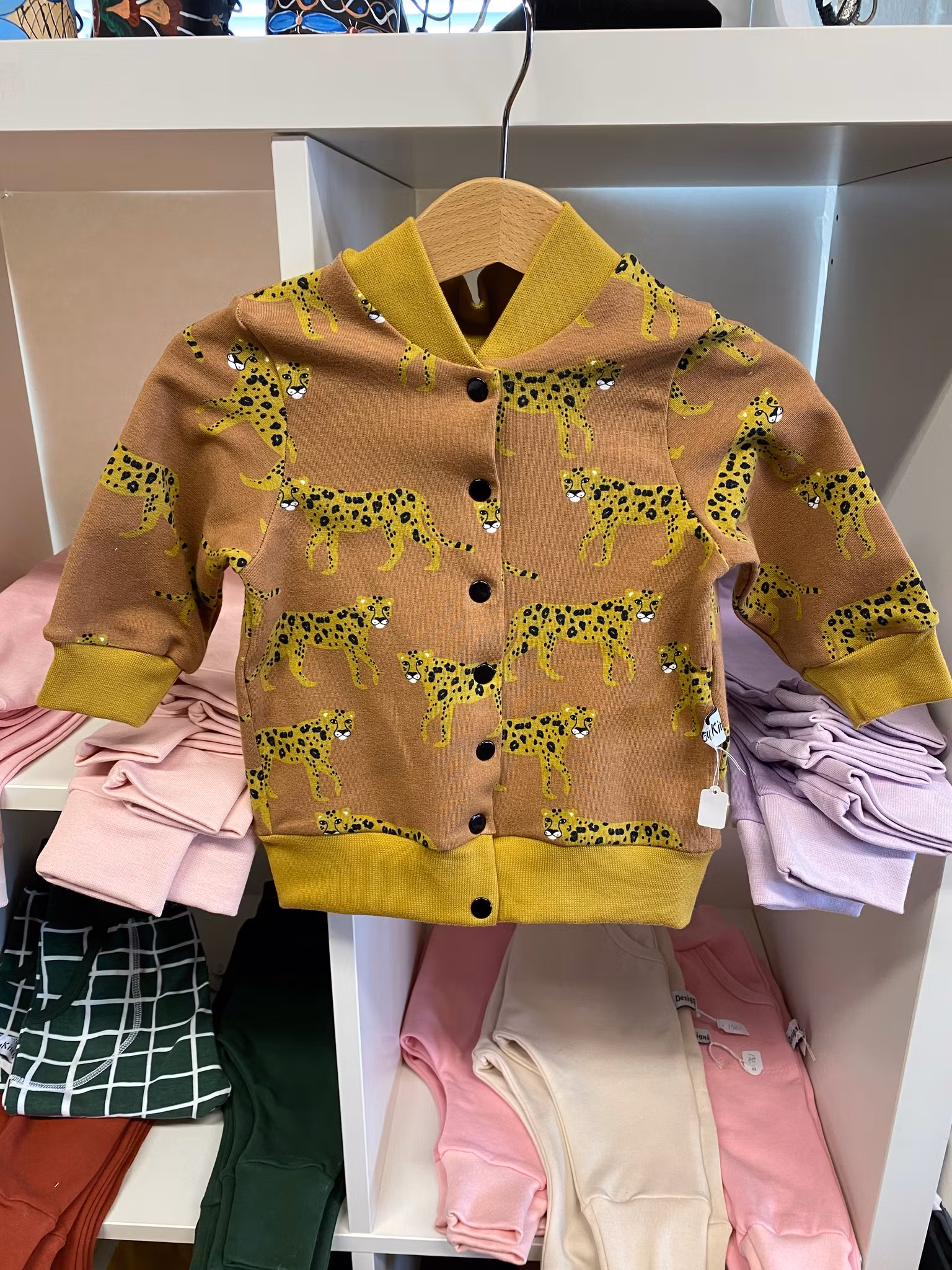 I lager. Tröja 150 kr Storlek 62 68 74 Lägg i korgen Tröja i joggingtyg med leopard på brun botten med tryckknappar